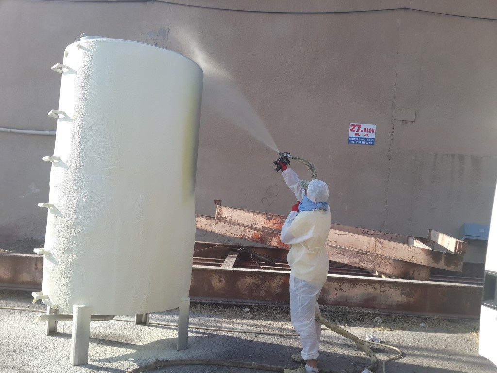 Sprey poliüretan köpük tankların izolasyonunda kullanılarak ısının kaybını ve dışarıya etkisini azaltmaktadır. Asıl olarak borulardan geçen maddelerin ısı değişikliklerine engelleyerek düzenli bir aktarma sağlamaktadır.