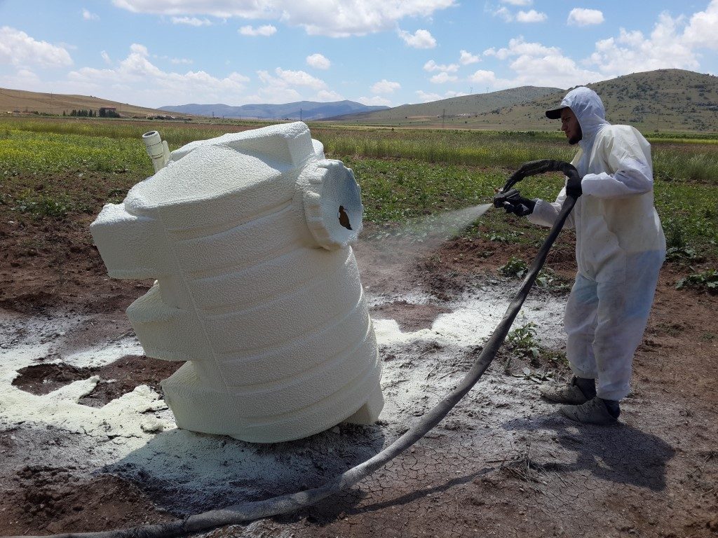Sprey poliüretan köpük tankların izolasyonunda kullanılarak ısının kaybını ve dışarıya etkisini azaltmaktadır. Asıl olarak borulardan geçen maddelerin ısı değişikliklerine engelleyerek düzenli bir aktarma sağlamaktadır.